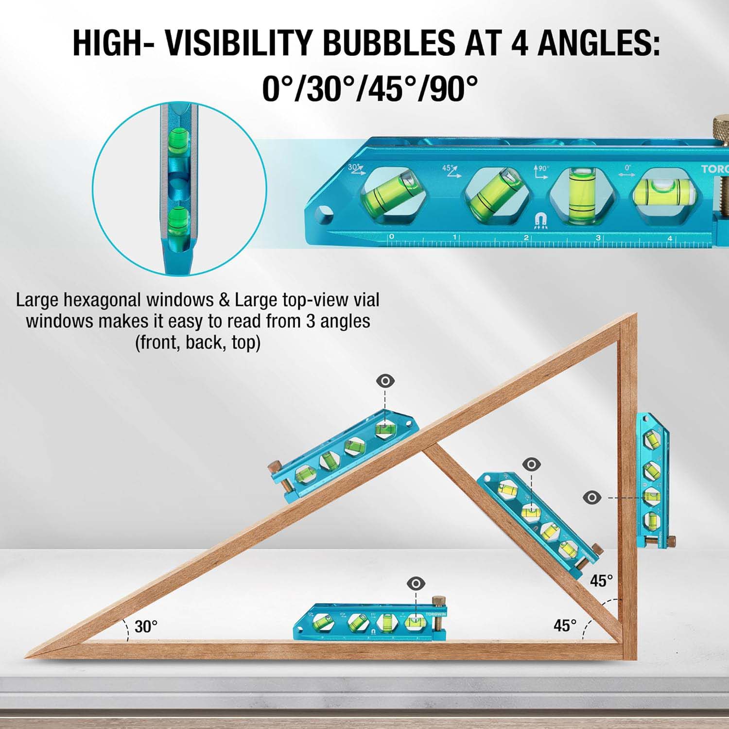 4 açıda (0°/30°/45°/90°) yüksek görünürlüğe sahip kabarcıkların varlığı büyük bir avantajdır. Bu kabarcıklar farklı yönlerden açıkça görülebilmektedir; bu, ister standart yatay veya dikey açılarda, ister 30° veya 45° gibi belirli eğik açılarda ölçüm yapıyor olalım, doğru okumalar elde edebileceğimiz anlamına gelir. Bu çok açılı kabarcık özelliği, seviyemizin çok yönlülüğünü önemli ölçüde artırır. Kabarcıklar hassas bir şekilde kalibre edildiğinden okumanın doğruluğu artar. Örneğin, eğimli bir yüzeyin eğimini 45°'lik bir açıyla ölçerken, kabarcığın konumu bize, daha az doğru kabarcık kalibrasyonu olan seviyelere kıyasla 0,05° kadar düşük bir hata oranıyla, açının son derece doğru bir göstergesini verebilir.